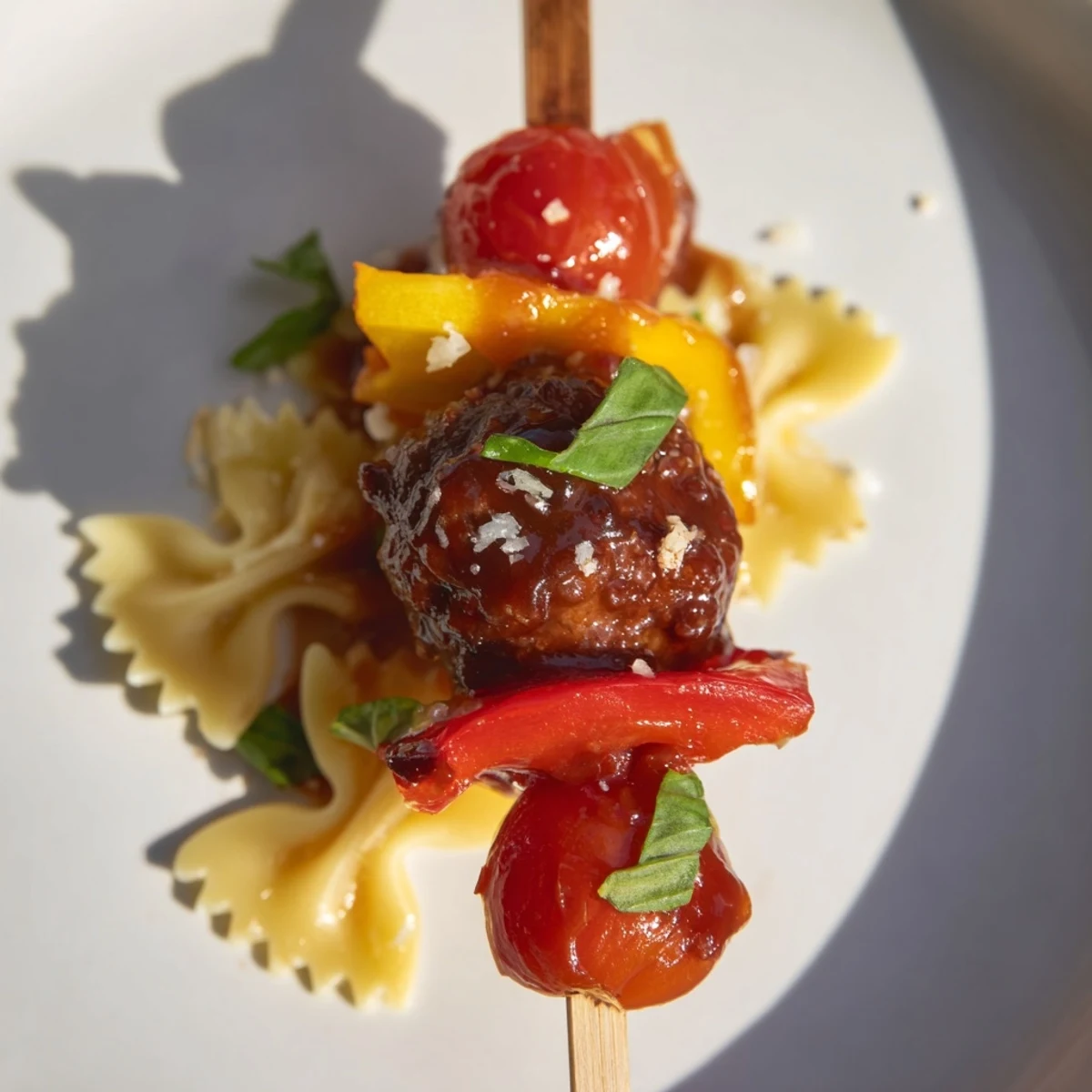 The first time I brought these skewers to a potluck, my friend Sarah actually asked if I'd catered them. Something about the playful bowtie pasta threaded next to meatballs just makes people smile before they even take a bite. I love how they look like party food but taste like a cozy Sunday dinner.