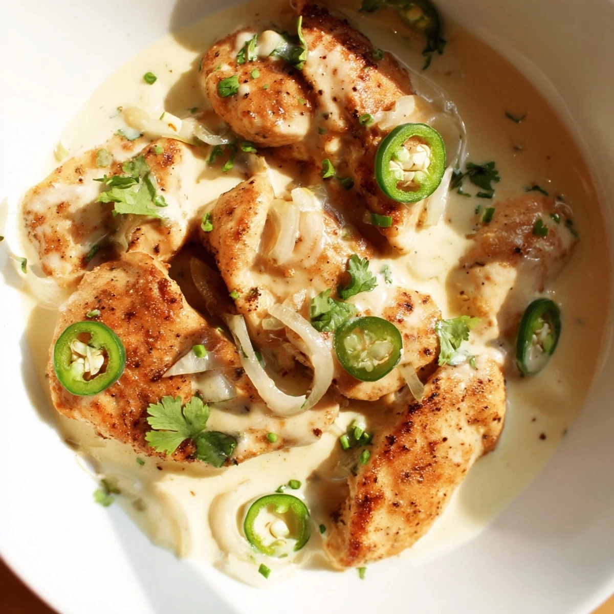 Tender pan-seared chicken breasts finished in a velvety cream sauce studded with sliced jalapeños and aromatic garlic. The dish comes together in under an hour, starting with seasoned chicken cooked until golden, then building a flavorful sauce in the same pan.