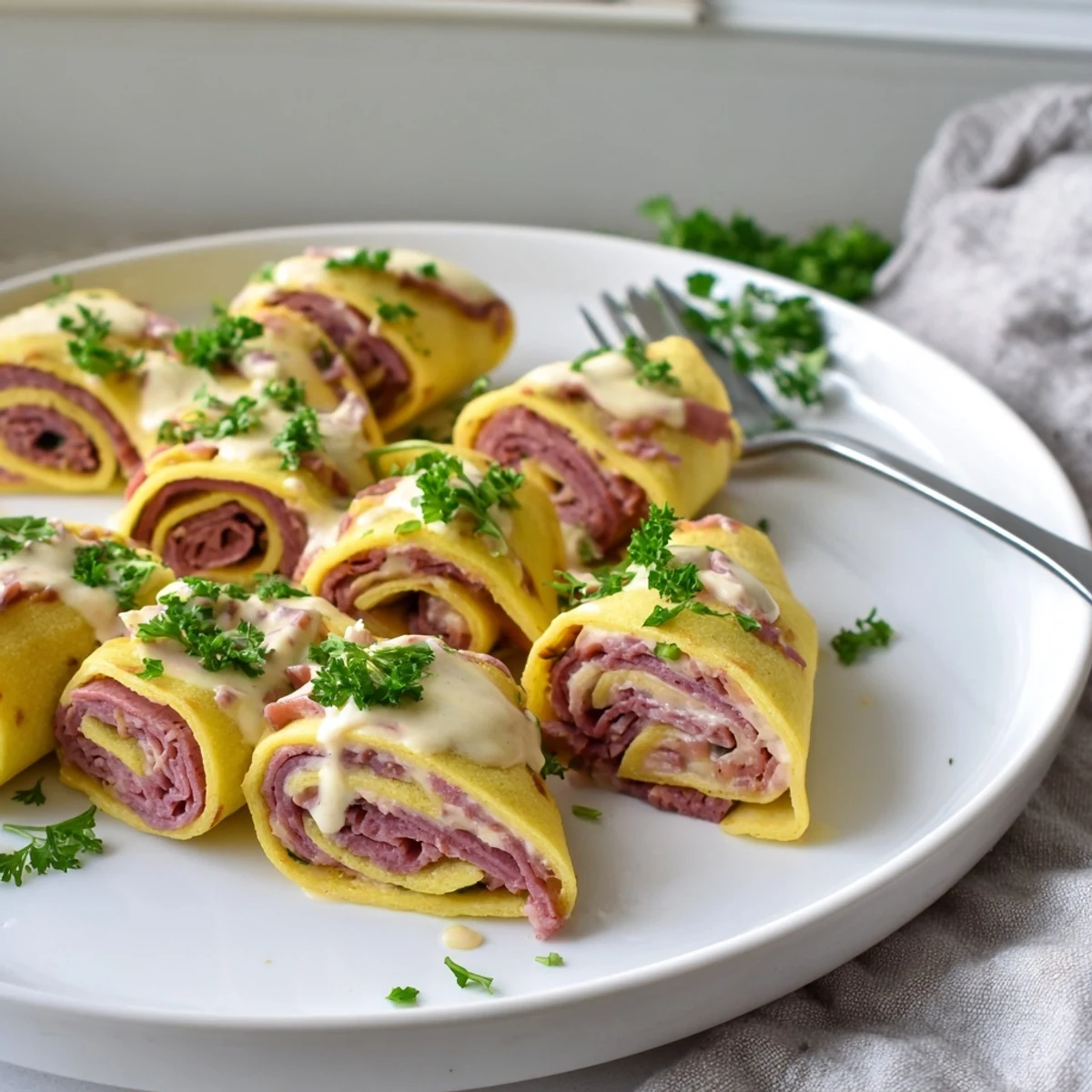 These low-carb roll ups capture everything you love about a classic Reuben sandwich without the bread. Thin, tender egg crepes replace the traditional rye, wrapping around savory corned beef, tangy sauerkraut, and melted Swiss cheese. A creamy Russian-style dressing ties all the flavors together, while the quick preparation makes this perfect for busy weeknights or meal prep.