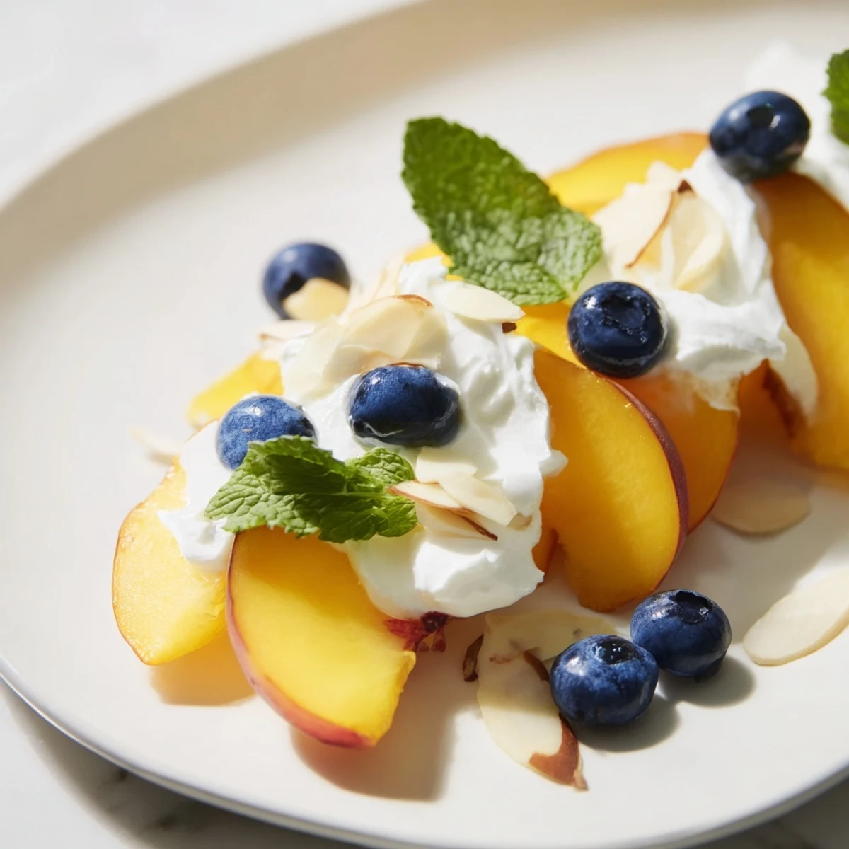 The natural sweetness of fresh peaches pairs beautifully with the rich, creamy topping, while fresh mint adds a bright, aromatic finish. Optional blueberries and sliced almonds bring extra color and crunch.