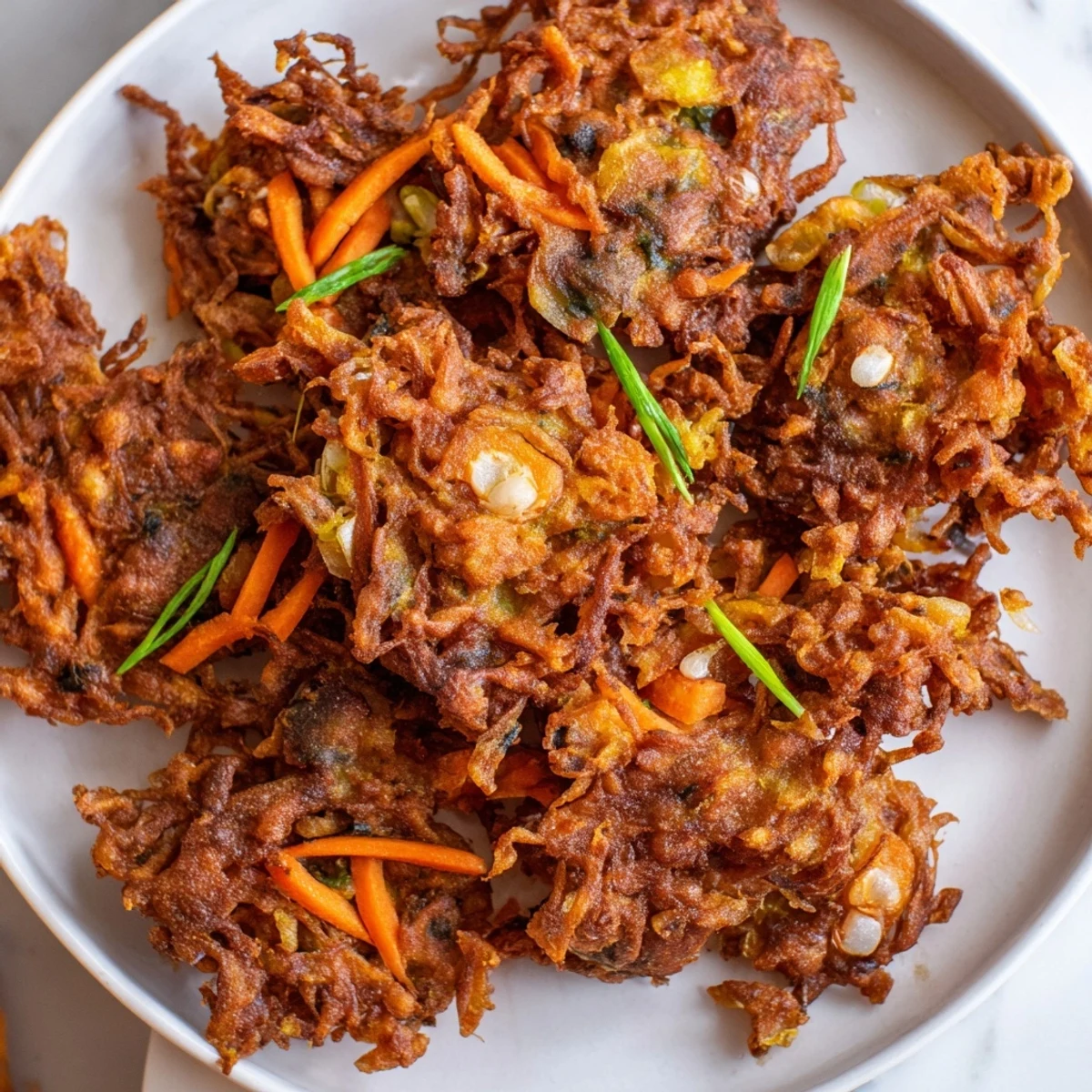 - Sweet potato and carrot: Julienned thin they become tender sweet pockets inside the crispy batter